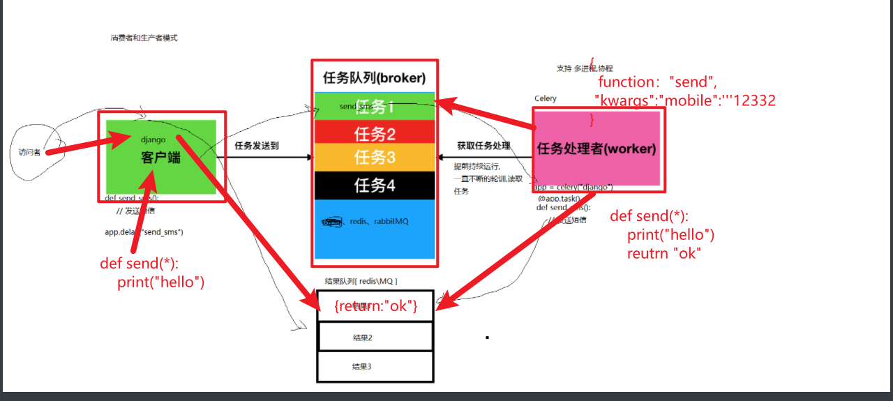 # 终端操作 # 因为celery模块安装在了虚拟环境中,所以要确保进入虚拟环境 conda activate luffycity cd ~/Desktop/luffycity/luffycityapi python manage.py shell # 调用celery执行异步任务 from mycelery.sms.tasks import send_sms1,send_sms2,send_sms3,send_sms4 mobile = "13312345656" code = "666666" # 有两种调用方式delay ,apply_async # delay 表示马上按顺序来执行异步任务,在celrey的worker工作进程有空闲的就立刻执行 # 可以通过delay异步调用任务,可以没有参数 ret1 = send_sms1.delay() # 可以通过delay传递异步任务的参数,可以按位置传递参数,也可以使用命名参数 # ret2 = send_sms.delay(mobile=mobile,code=code) ret2 = send_sms2.delay(mobile,code) # apply_async 让任务在后面指定时间后执行,时间单位:秒/s # 任务名.apply_async(args=(参数1,参数2), countdown=定时时间) ret4 = send_sms4.apply_async(kwargs={"x":10,"y":20},countdown=30) # 根据返回结果,不管delay,还是apply_async的返回结果都一样的。 ret4.id # 返回一个UUID格式的任务唯一标志符,78fb827e-66f0-40fb-a81e-5faa4dbb3505 ret4.status # 查看当前任务的状态 SUCCESS表示成功! PENDING任务等待 ret4.get() # 获取任务执行的结果[如果任务函数中没有return,则没有结果,如果结果没有出现则会导致阻塞] # 要判断状态 否则ret4.get()可能会阻塞的 if ret4.status == "SUCCESS": print(ret4.get())