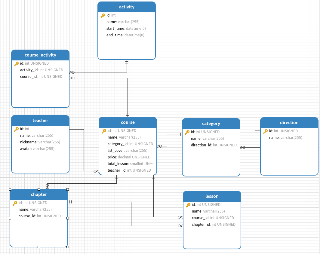 class CourseChapter(BaseModel): """课程章节""" orders = models.SmallIntegerField(default=1, verbose_name="第几章") summary = RichTextUploadingField(blank=True, null=True, verbose_name="章节介绍") pub_date = models.DateField(auto_now_add=True, verbose_name="发布日期") course = models.ForeignKey("Course", related_name='chapter_list', on_delete=models.CASCADE, db_constraint=False, verbose_name="课程名称") class Meta: db_table = "fg_course_chapter" verbose_name = "课程章节" verbose_name_plural = verbose_name def __str__(self): return "%s-第%s章-%s" % (self.course.name, self.orders, self.name) # 自定义字段 def text(self): return self.__str__() # admin站点配置排序规则和显示的字段文本提示 text.short_description = "章节名称" text.allow_tags = True text.admin_order_field = "orders" class CourseLesson(BaseModel): """课程课时""" lesson_type_choices = ( (0, '文档'), (1, '练习'), (2, '视频'), ) orders = models.SmallIntegerField(default=1, verbose_name="第几课时") lesson_type = models.SmallIntegerField(default=2, choices=lesson_type_choices, verbose_name="课时种类") lesson_link = models.CharField(max_length=255, blank=True, null=True, help_text="若是video,填视频地址或者视频id,若是文档,填文档地址", verbose_name="课时链接") duration = models.CharField(blank=True, null=True, max_length=32, verbose_name="课时时长") # 仅在前端展示使用 pub_date = models.DateTimeField(auto_now_add=True, verbose_name="发布时间") free_trail = models.BooleanField(default=False, verbose_name="是否可试看") recomment = models.BooleanField(default=False, verbose_name="是否推荐到课程列表") chapter = models.ForeignKey("CourseChapter", related_name='lesson_list', on_delete=models.CASCADE, db_constraint=False, verbose_name="章节") course = models.ForeignKey("Course", related_name="lesson_list", on_delete=models.DO_NOTHING, db_constraint=False, verbose_name="课程") class Meta: db_table = "fg_course_lesson" verbose_name = "课程课时" verbose_name_plural = verbose_name def __str__(self): return "%s-第%s章-%s-第%s课时-%s" % (self.course.name,self.chapter.orders, self.chapter.name, self.orders, self.name) def text2(self): return self.__str__() text2.short_description = "课时名称" text2.allow_tags = True text2.admin_order_field = "orders"