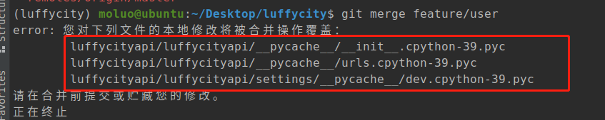 # 确认前面功能已经开发完整,review代码结束,向公司申请合并分支,开发合并分支 cd /home/moluo/Desktop/luffycity git add . git commit -m "feature: 展示课程列表页" git push # 切换分支 git checkout master # 合并代码操作 git merge feature/user