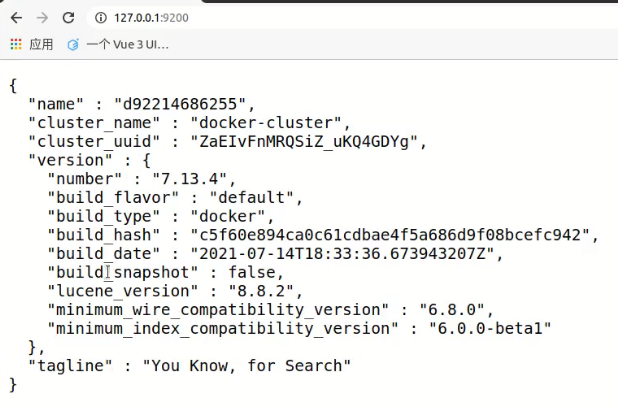 --name elasticsearch 设置当前容器的容器名称为elasticsearch --restart=always 设置容器开机自启,即便物理机关机重启了,docker在启动以后也会自动帮我们把当前容器启动起来。 -d 设置当前容器为守护式容器,在后台运行 -p 9200:9200 设置端口影射,<物理机端口>:<容器端口> 表示访问了当前物理机的9200,相当于访问了当前容器的9200端口 -p 9300:9300 设置端口影射,<物理机端口>:<容器端口> 表示访问了当前物理机的9300,相当于访问了当前容器的9300端口 -e ES_JAVA_OPTS="-Xms256m -Xmx256m" 设置环境变量,变量名为ES_JAVA_OPTS,这个变量是启动elasticsearch的关键。 表示设置java环境的最小和最大使用内存,内存不足,elasticsearch是无法启动的,所以此处设置为最小内存必须在256M以上 -e "discovery.type=single-node" 设置环境变量,变量名discovery.type discovery.type 表示当前elasticsearch的运作模式为single-node,表示单机部署/单点部署 elasticsearch:7.13.4 设置当前容器的镜像名和版本号