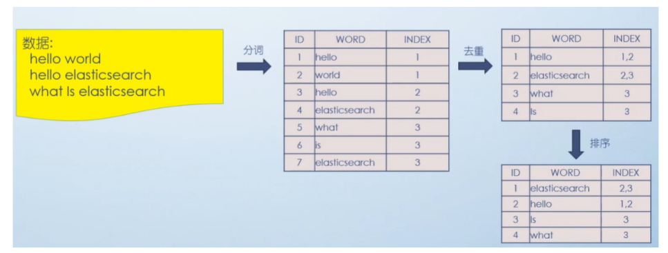 倒排索引:指的是将文档内容中的单词作为索引,将包含该词的文档ID作为记录。单词找id