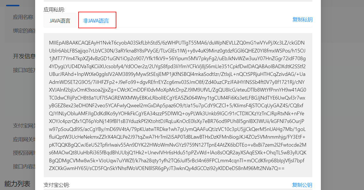 应用的公钥和私钥,支付宝本身已经提供了。所以,我们直接复制到本地保存起来即可。