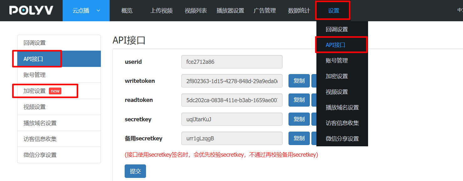 要开发播放保利威的加密视频开发功能,需要在设置->API接口和加密设置。