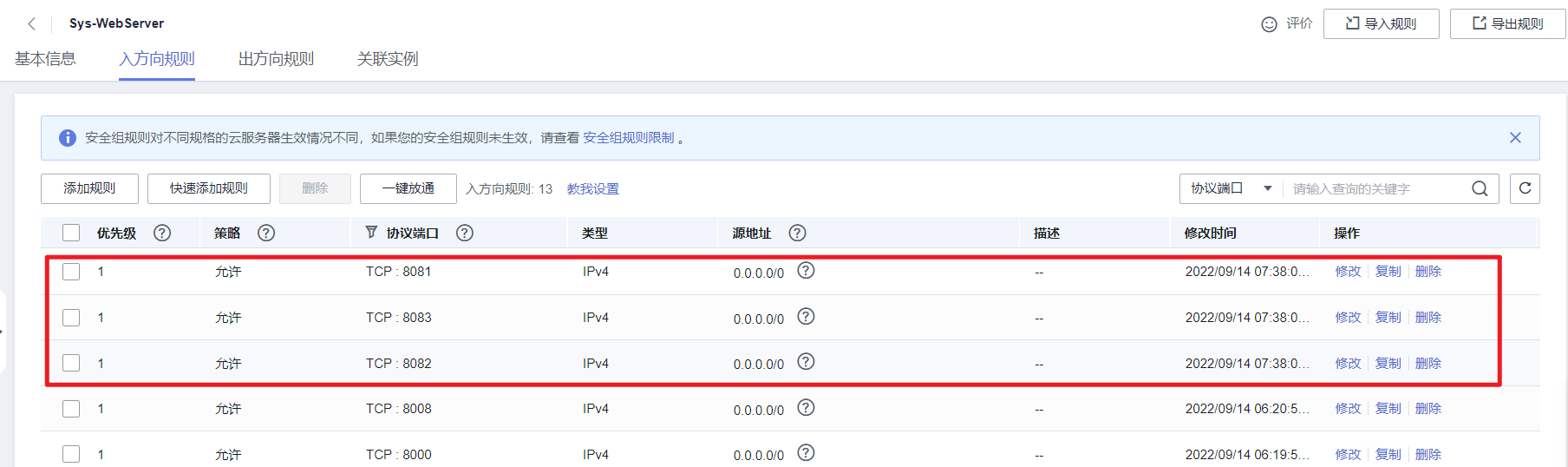注意:在云服务器上找到安全组,并在入方向,开放上述的端口,例如:8000。