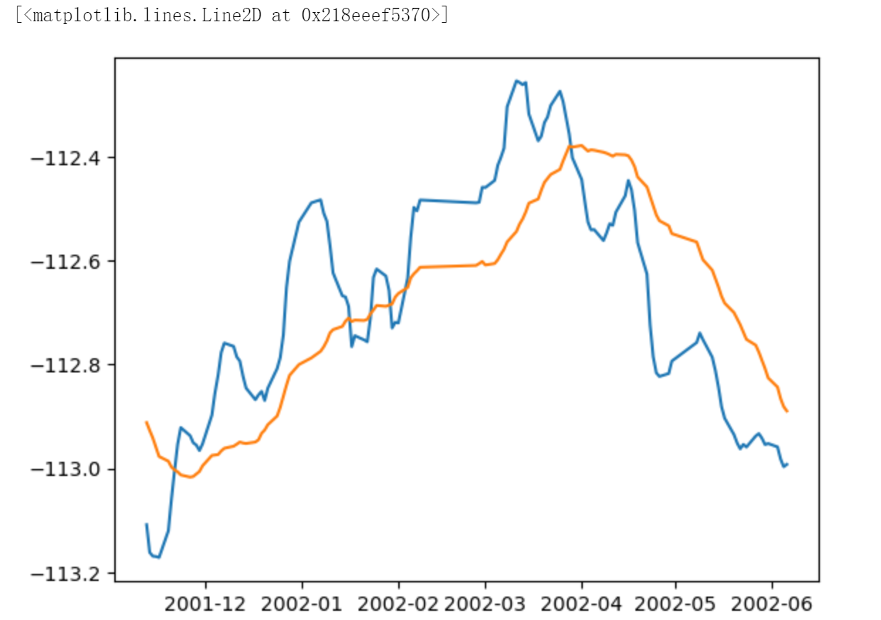 # 将均线画出 import matplotlib.pyplot as plt %matplotlib inline # 画线 plt.plot(ma5[50:180]) plt.plot(ma30[50:180])