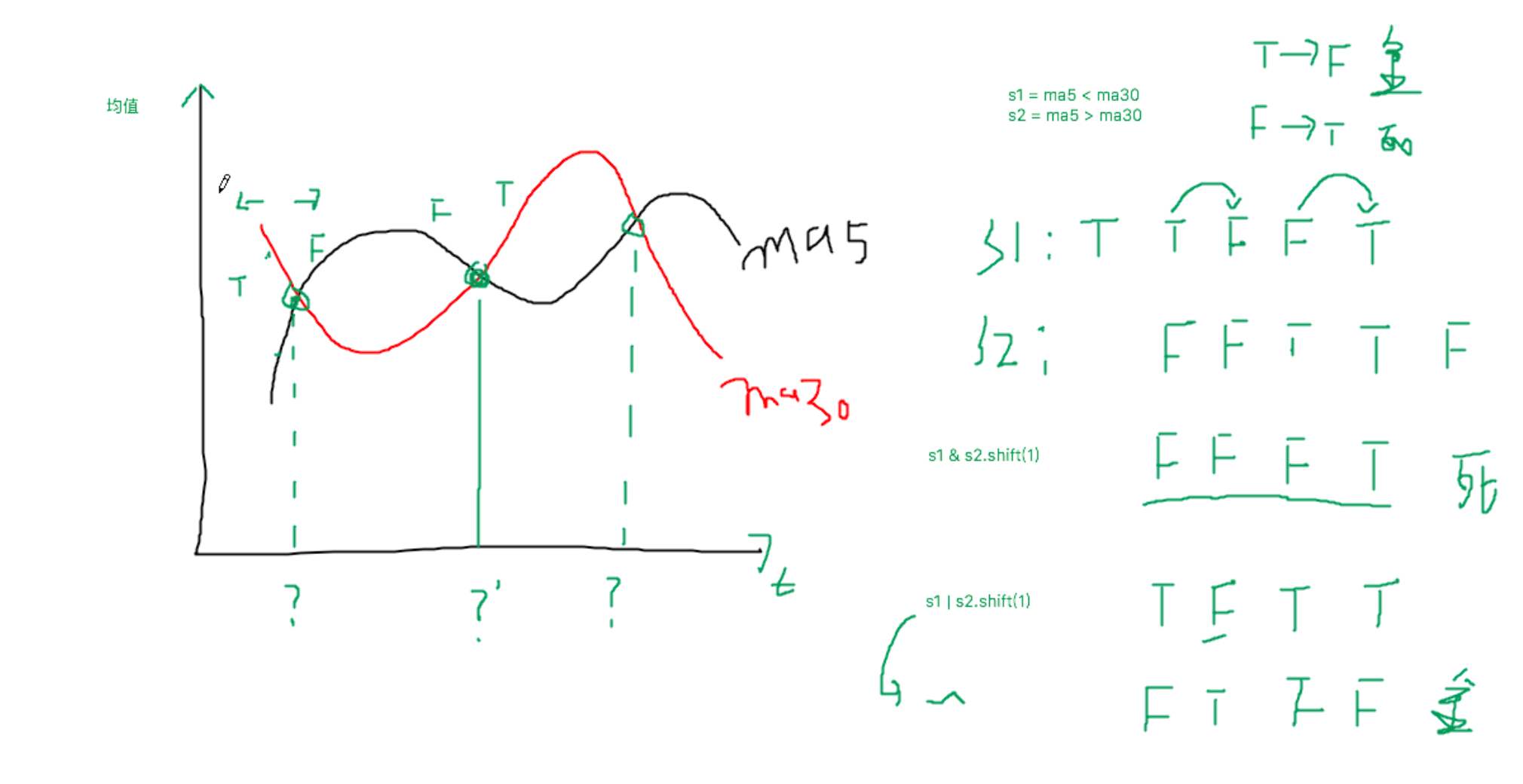 df = df[30:] # shift(1)往后移一位 death_ex = s1 & s2.shift(1) #判定死叉的条件 如图s1和s2后移动1位的布尔值进行逻辑运算 df.loc[death_ex] #死叉对应的行数据 death_date = df.loc[death_ex].index # 死叉对应时间 golden_ex = ~(s1 | s2.shift(1))#判定金叉的条件 golden_date = df.loc[golden_ex].index #金叉的时间