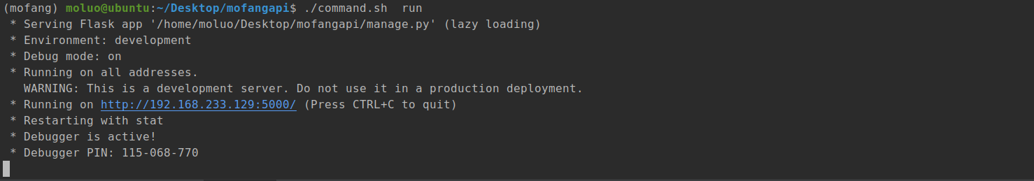 #!/usr/bin/env bash export FLASK_APP="/home/moluo/Desktop/yingmingapi/manage.py" export FLASK_DEBUG=True if [ $1 ]; then if [ $1 == "run" ]; then flask run --host=0.0.0.0 --port=5000 else flask $1 fi fi