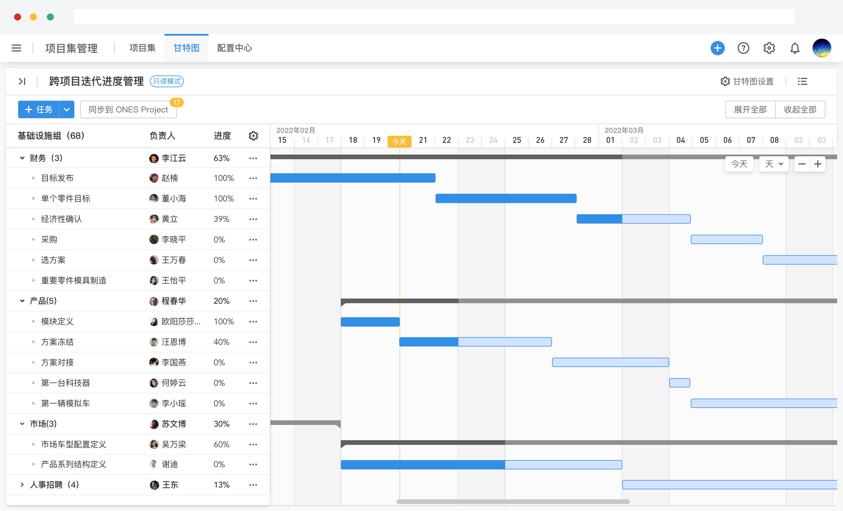 2.支持将多个项目汇总至项目集,增强管理者对项目全局的掌控能力;及提供多项目进度管控和,为管理者提供项目风险预警和决策支持。