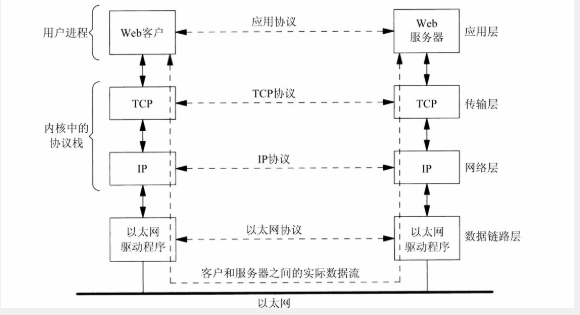 web客户 与 服务器之间使用TCP通信,TCP又转而使用IP通信,IP再通过数据链路层通信。