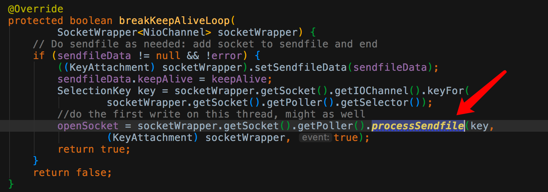 tomcat 在处理一下心跳保活时,也会调用该 sendFile 方法。
