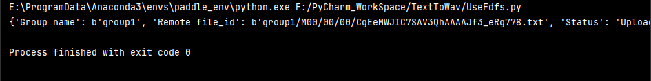 from fdfs_client.client import get_tracker_conf, Fdfs_client tracker_conf = get_tracker_conf('./fastfdfs_client.conf') client = Fdfs_client(tracker_conf) #文件上传 result = client.upload_by_filename('./static/1.txt') print(result) #文件下载 result = client.download_to_file('./test.txt', b'group1/M00/00/00/CgEeMWJGmAKAVv3tAAAADplm3rU765.txt') print(result) #文件删除 result = client.delete_file(b'group1/M00/00/00/CgEeMWJGmAKAVv3tAAAADplm3rU765.txt') print(result) #列出所有的group信息 result = client.list_all_groups() print(result)