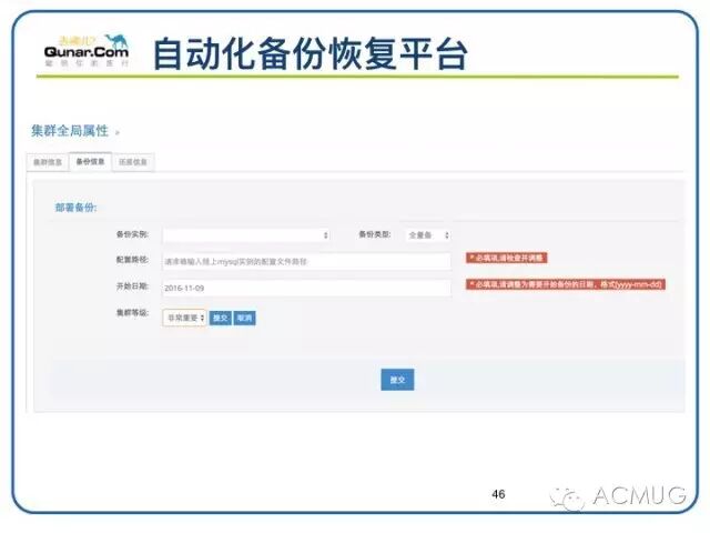 备份恢复的雏形完成后开始编写后台脚本实现功能需求,经过一段时间后台脚本运行的验证,需要集中同一套后台代码程序兼容不同mysql版本、不同高可用架构的定时备份,即集中统一管理,无特例个性。当手动操作变得规律性、完整性、正确性,DBA开始希望能够有平台统一集中管理备份恢复调度,通过界面可视化操作。DBA开始将备份恢复功能集成在DBA开发的DUBAI平台里面,整个平台后端使用python、shell语言编写,web前端页面使用tonardo实现。利用DUBAI平台很轻松的面对大量MySQL 实例的备份恢复管理,可视化配置部署及进度信息展示。