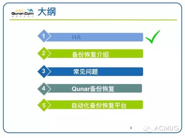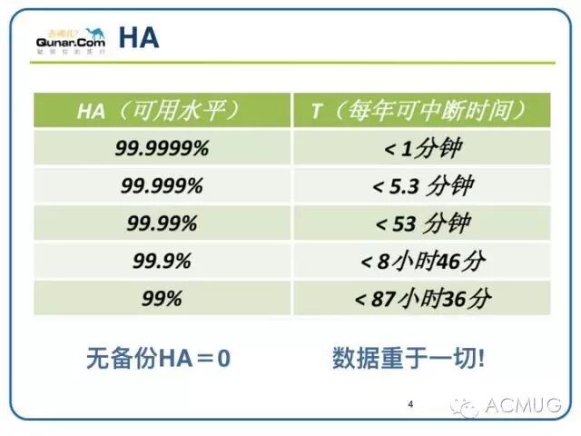 说到DBA每天都要和数据打交道在数据就是金钱的时代如何预防由于软硬件故障或其他原因导致数据的损坏一直是个热点话题根据墨菲法则凡事只要有可能出错那就一定会出错那对于掌管企业数据命脉的DBA来说避免数据损坏的备份恢复是DBA工作的重中之重业内关于高可用有一个HA标准关于可用性分级9越多说明越容错可用性越高举个例子5个9的算法是系统1年内服务中断维护了5分钟那HA可用率1年/(1年5分钟)数据这么重要没有备份某种意义上可以说其实HA0在qunar数据的高可用一直是个重要的话题