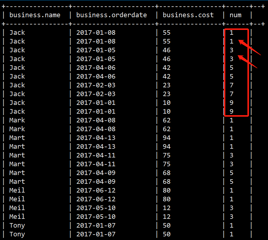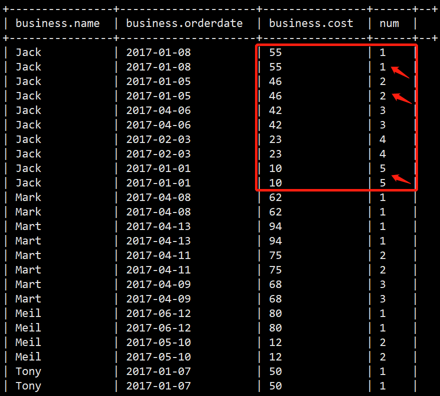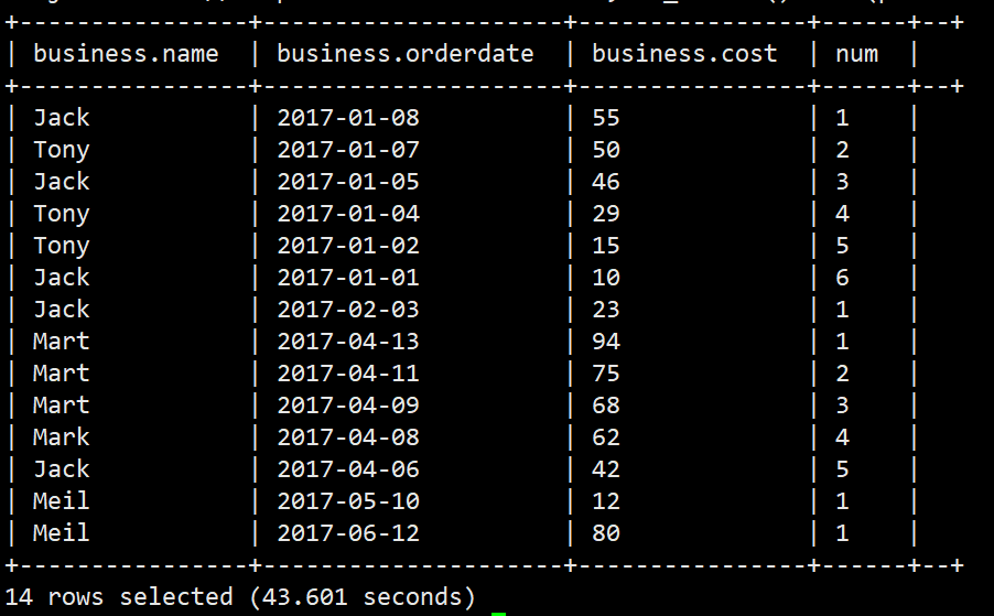 select *,dense_rank() over(partition by name order by cost desc) as num from business;