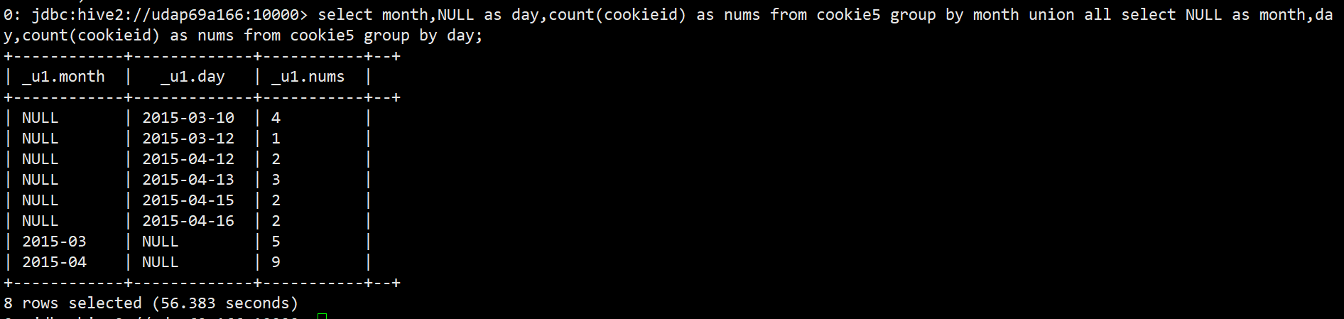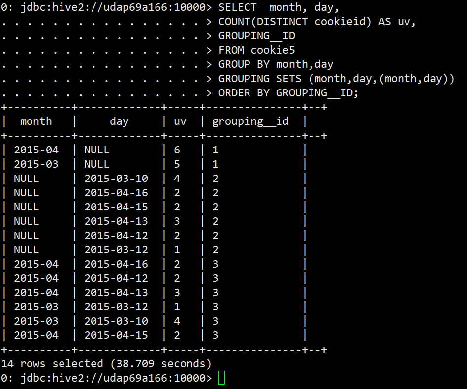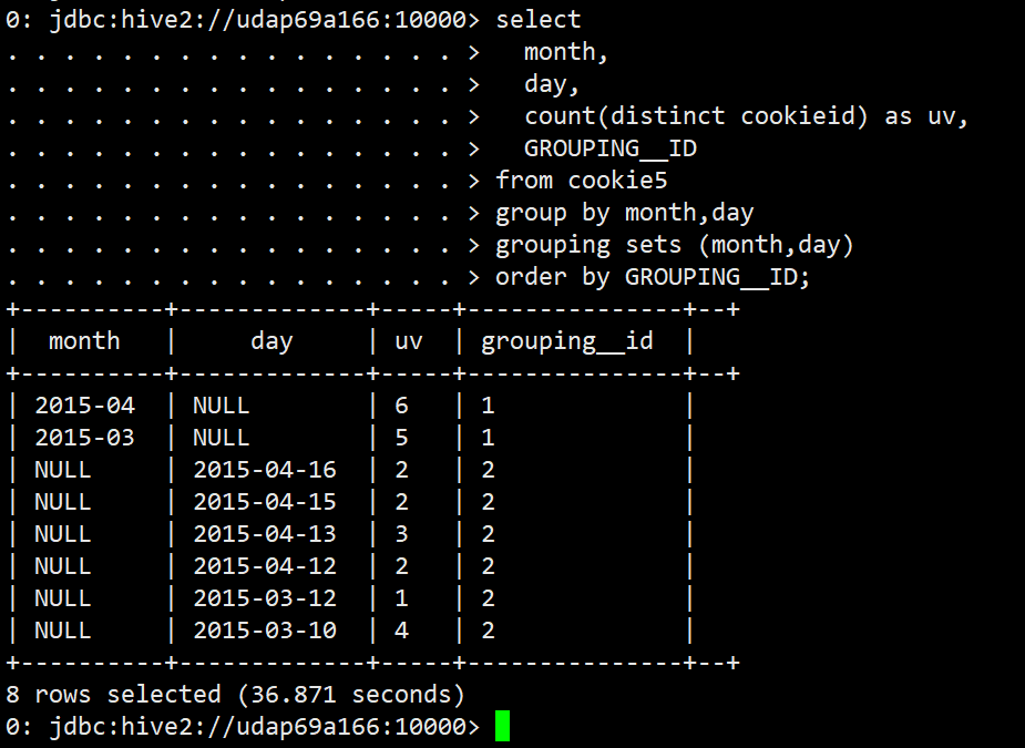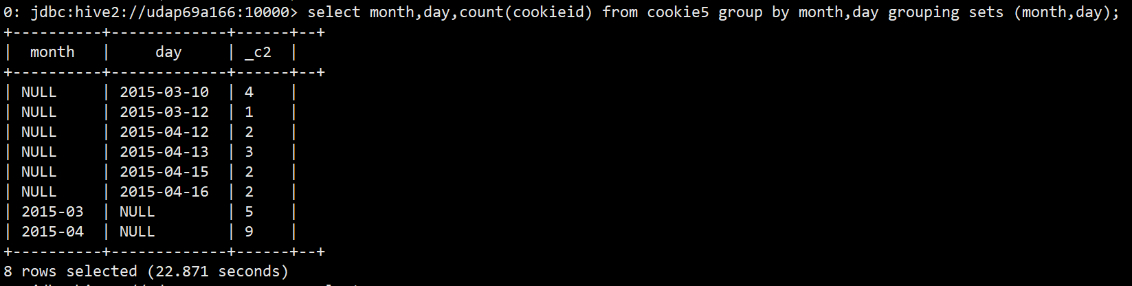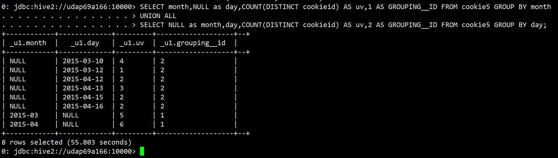 SELECT NULL as month,day,COUNT(DISTINCT cookieid) AS uv,2 AS GROUPING__ID FROM cookie5 GROUP BY day;