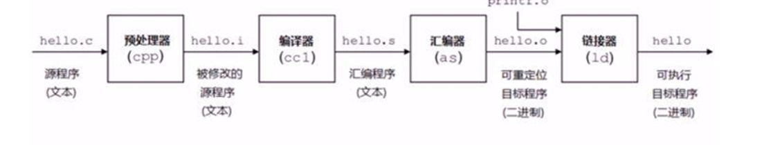实现过程:C 程序源代码 --> 预处理 --> 编译 --> 汇编 --> 链接
