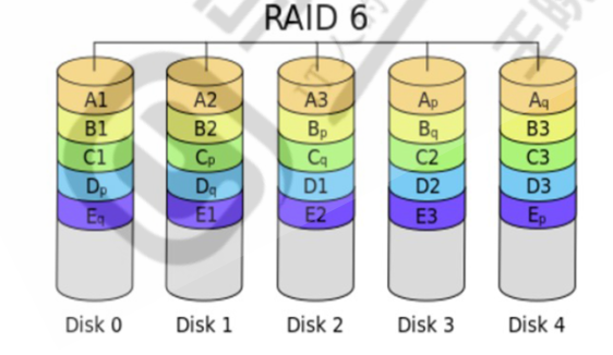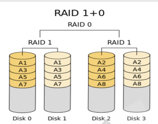 RAID-50:多块磁盘先实现RAID5,再组合成RAID0