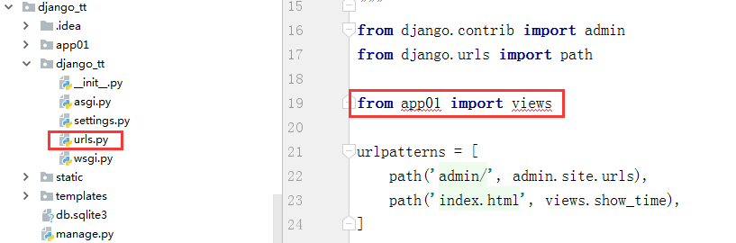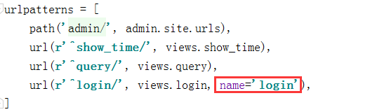 from django.contrib import admin from django.urls import path from django.conf.urls import url, include # 老版本django默认引入这种形式,可以写正则 from blog import views # 不同应用导入相应的views.py模块 from app01 import views as v1 from app02 import views as v2 urlpatterns = [ path('admin/', admin.site.urls), url(r'^show_time/', views.show_time), path('login/', v1.login), url(r'^register/', v2.register), url(正则表达式, views视图函数, 参数, 别名), ]
