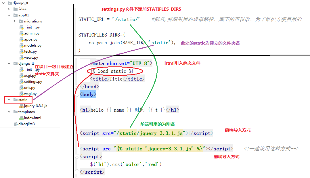 方式一: <script src="/static/jquery-3.3.1.js"></script> 方式二:建议用这种方式 {% load static %} <script src="{% static 'jquery-3.3.1.js' %}"></script>