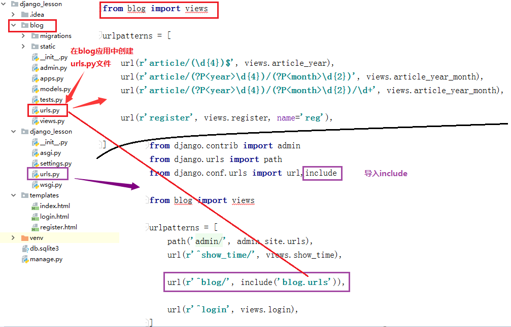 对不同的应用可以创建不同的urls.py文件,通过对url进行二级分发,达到方便管理的目的,通过 include 方式进行分发,此时应用blog下的url样例为:http://127.0.0.1:8001/blog/article/2004