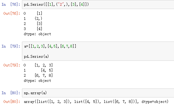 Series 中包含的数据类型可以是整数、浮点、字符串、列表、元组、ndarray等