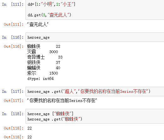 Series 和字典非常类似,我们可以将index和其标签看成是key,对应的值看成是value。两个有很多类似的操作,比如Series同样可以使用.get()方法,且如果在Series中无法找到要找的值,可以设定返回默认值: