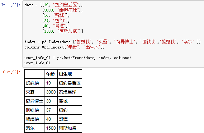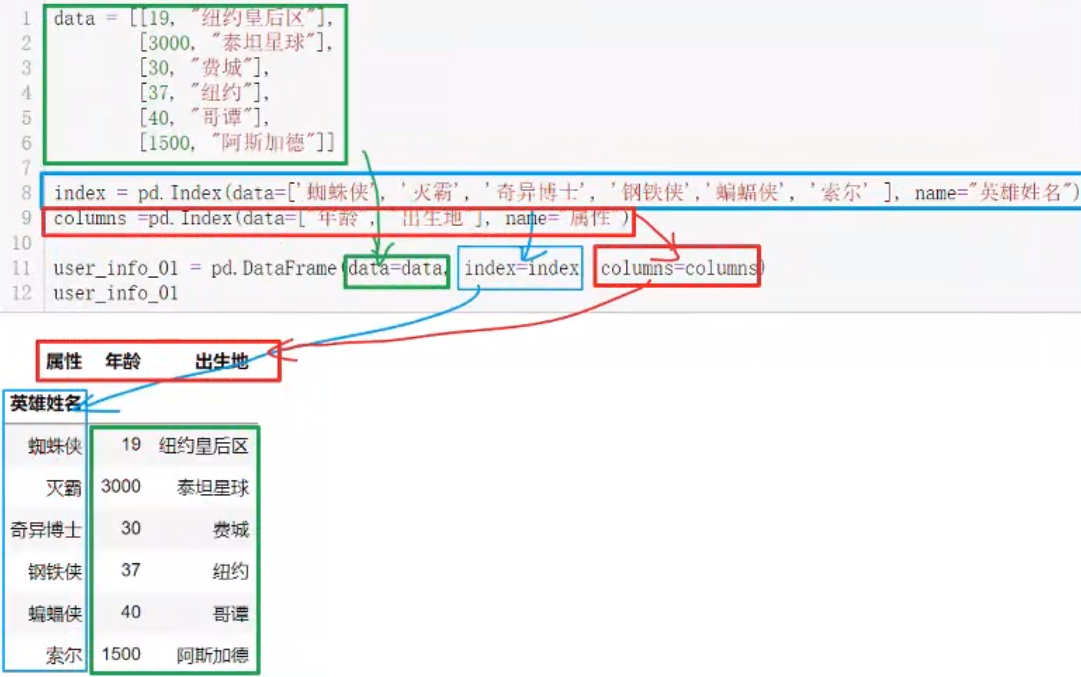 构建一个嵌套列表,然后再生成一个列标签columns,最后生成一个Index对象,这样,data、colunms、Index 三个对象就构成了DataFrame
