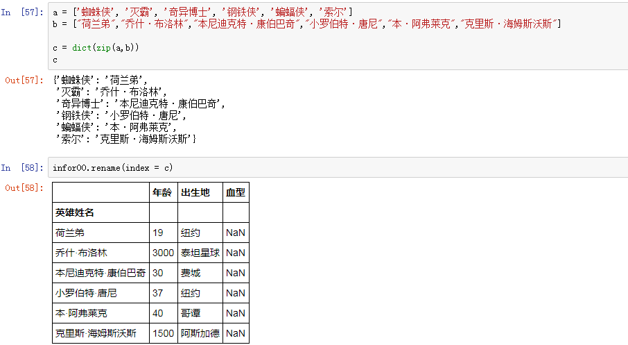 使用 df.rename() 将整个索引标签替换掉,包括行标签index,列标签columns,只需要建立一个映射字典: