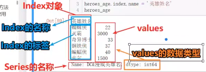 综上所述,一个Series包括了data,index 以及 name,但是按照上面的方法,定义一个完整元素的 Series 的索引,需要先定义索引标签,再定义索引的名字,未免太繁琐。可以通过定义 Index 对象,再将其赋值到Series 中的 index 参数,这样可以一次性定义一个有完整元素的Series索引