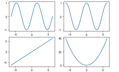 import matplotlib as mpl import matplotlib.pyplot as plt x = np.linspace(-2*np.pi,2*np.pi,200) y_01 = np.sin(x) y_02 = np.cos(x) y_03 = x y_04 = x**2 plt.subplot(221) # 设置子图的位置 plt.plot(x, y_01, label="sin(x)") plt.subplot(222) plt.plot(x, y_02, label="cos(x)") plt.subplot(223) plt.plot(x, y_03, label="x"); plt.subplot(224) plt.plot(x, y_04, label="x**2") plt.show()