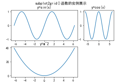 plt.subplot2grid((2,3), (0,2)) #在一个2行3列的网格,从第1行第3列开始绘制,横跨1列 plt.plot(x, y_02) plt.title("y=cos(x)") plt.subplot2grid((2,3), (1,0), colspan=2) #在一个2行3列的网格,从第2行第1列开始绘制,横跨2列 plt.plot(x, y_03); plt.title("y=x^2") plt.suptitle("subplot2grid()函数的实例展示") plt.show()
