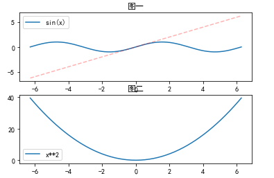 import matplotlib as mpl import matplotlib.pyplot as plt import numpy as np x = np.linspace(-2*np.pi,2*np.pi,200) y_01 = np.sin(x) y_02 = x**2 ax_01 = plt.subplot(211) ax_01.plot(x, y_01, label="sin(x)") ax_01.legend() ax_01.set_title("图一") ax_02 = plt.subplot(212) ax_02.plot(x, y_02, label="x**2") ax_02.legend() ax_02.set_title("图二") #如果在画完两幅子图之后,在这个时候想再往图一添加折线图y=x,可以直接通过实例ax[0].plot()来画: ax_01.plot(x, x, color="r", ls="--", alpha=0.3) plt.show()