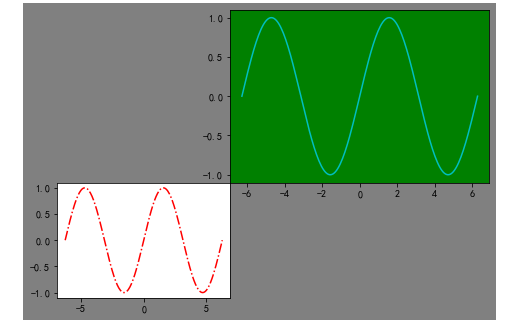 import matplotlib.pyplot as plt import numpy as np x = np.linspace(-2*np.pi,2*np.pi,200) y = np.sin(x) fig = plt.figure(1, facecolor="gray") #建立“画板1”,颜色设置为灰色 ax_1 = plt.axes([0, 0, 0.4, 0.4], facecolor="w") # 建立轴域1(画纸),颜色设置成白色,起点原点,长宽均为整体长宽的0.4倍 ax_1.plot(x, y, ls="-.", color="r") ax_2 = plt.axes([0.4, 0.4, 0.6, 0.6], facecolor="g") # 建立轴域2(画纸),颜色设置成绿色,起点为0.4倍整体长宽的位置,长宽均为整体长宽的0.6倍 ax_2.plot(x, y, ls="-", color="c") plt.show()