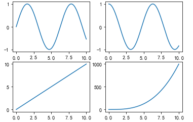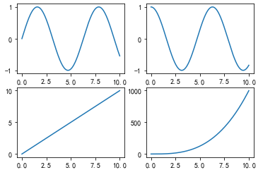 import matplotlib.pyplot as plt import numpy as np x = np.linspace(0,10,1000) y_1 = np.sin(x) y_2 = np.cos(x) y_3 = x y_4 = x ** 3 fig, ax = plt.subplots(2,2) # 通过 plt.subplots() 返回“画板”和“画纸” ax_01 = ax[0][0] # 或者ax_01 = ax[0,1]