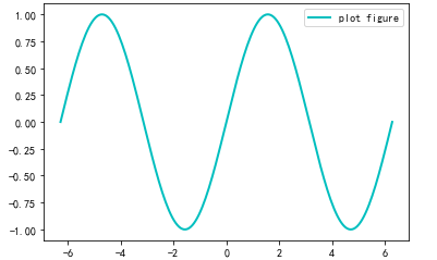 import matplotlib.pyplot as plt import numpy as np x = np.linspace(-2*np.pi,2*np.pi,200) y = np.sin(x) fig = plt.figure() # 建立“画板” ax = plt.axes() # 建立“画纸” ax.plot(x, y, ls="-", lw=2, label="plot figure", color="c") ax.legend() # plt.plot(x,y,ls="-",lw=2,label="plot figure",color="c") # plt.legend() #将标签显示出来 plt.show()