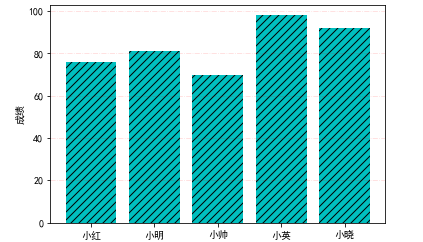 import matplotlib.pyplot as plt import numpy as np fig = plt.figure() ax = plt.axes() x = [i for i in range(1,6)] y = np.random.randint(45,100,5) z = ("小红","小明","小帅","小英","小晓") ax.set_ylabel("成绩") ax.grid(linestyle="-.", color="r", axis="y", alpha=0.15) ax.bar(x, y, align="center", color="c", tick_label=z, hatch="///") # plt.ylabel("成绩") # plt.grid(linestyle="-.",color="r",axis="y",alpha=0.15) # plt.bar(x,y,align="center",color="c",tick_label=z,hatch="///") plt.show()