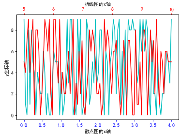 import matplotlib as mpl import matplotlib.pyplot as plt fig, ax_01 = plt.subplots() #生成一个画布对象fig,以及一个坐标轴实例数组ax_01 #通过实例ax_01绘制x、y坐标轴标签 x = np.linspace(0.0,4.0,100) y_01 = np.random.randint(0, 10, 100) ax_01.plot(x, y_01, c="c") #通过实例ax_01来绘图 ax_01.set_xlabel("散点图的x轴") ax_01.set_ylabel("y坐标轴") ax_01.tick_params("x", colors="b") # 绘制ax_01的y坐标轴的主刻度线和刻度标签颜色(蓝色) #通过ax.twins()来“克隆”ax_01的双胞胎轴域ax_02 ax_02 = ax_01.twiny() x = np.linspace(5.0 , 10.0,100) y_02 = np.random.randint(0, 10, 100) ax_02.plot(x, y_02, c="r") ax_02.set_xlabel("折线图的x轴") ax_02.tick_params("x", colors="r") # 绘制ax_02的y坐标轴的主刻度线和刻度标签颜色(红色) plt.show()