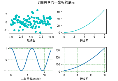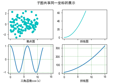 import matplotlib as mpl import matplotlib.pyplot as plt fig, ax = plt.subplots(2, 2, sharex="all") #修改sharex,sharey ax_01 = ax[0,0] x_01 = np.linspace(0.0,10.0,100) y_01 = np.random.randn(100) ax_01.scatter(x_01, y_01, c="c") ax_01.set_xlabel("散点图") ax_02 = ax[0,1] x_02 = np.linspace(0.0,8.0,100) y_02 = x_02**2 ax_02.plot(x_02, y_02, c="c") ax_02.set_xlabel("折线图") ax_03 = ax[1,0] x_03 = np.linspace(0.0,12.0,100) y_03 = np.cos(x_03) ax_03.plot(x_03, y_03, lw=2, ls="-") ax_03.grid(True, ls=":", c="g") ax_03.set_xlabel("三角函数cos(x)") ax_04 = ax[1,1] x_04 = np.linspace(0.0,15.0,100) y_04 = (x_04+3)**2 ax_04.plot(x_04, y_04, lw=2, ls="-") ax_04.grid(True, ls=":", c="g") ax_04.set_xlabel("折线图") plt.suptitle("子图共享同一坐标的展示") plt.show()