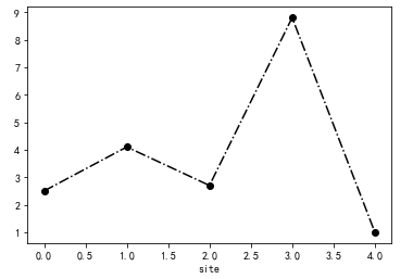 import pandas as pd series = pd.Series([2.5, 4.1, 2.7, 8.8, 1.0]) series.index.name='site' # series的索引会转化为横坐标,索引的标签会转化为横坐标的标签名 series.plot(kind="line", linestyle='-.', color='k', marker='o');