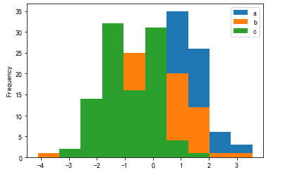 # plt.figure() #表示设定绘制图标对象 df= pd.DataFrame({'a': np.random.randn(100) + 1, 'b': np.random.randn(100), 'c': np.random.randn(100) - 1}, index=range(1,101), columns=['a', 'b', 'c']) df.plot.hist();