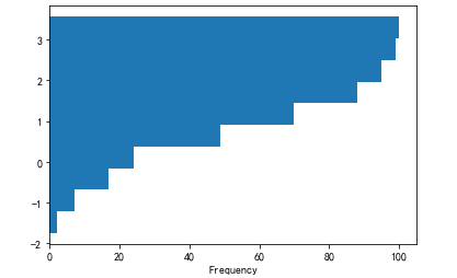 df['a'].plot.hist(orientation='horizontal', cumulative=True); # 该图是将DataFrame对象当中的a进行数值累加,并绘制横向直方图,横轴表示频率(Frequency),纵轴表示数值 # cumulative=True的效果是将各Frequency的数值累加
