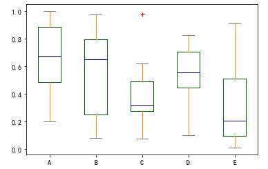 np.random.seed(80) a = np.random.rand(10, 5) #np.random.rand产生的随机数都为0-1之间的正数 df = pd.DataFrame(a, columns=['A', 'B', 'C', 'D', 'E']) df.plot.box();