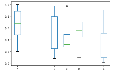 #可绘制水平箱线图, positions 表示的意思是 ABCDE 这5个箱线图摆放位置,A在1位置,B在4位置,AB之间间隔2,3这两个位置 df.plot.box(vert=True, positions=[1, 4, 5, 6, 8], sym='k*');