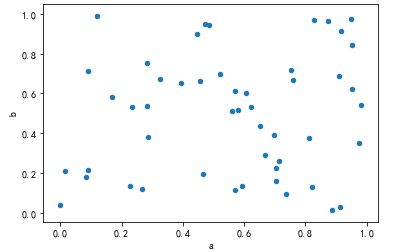 import pandas as pd np.random.seed(80) df = pd.DataFrame(np.random.rand(50, 4), columns=['a', 'b', 'c', 'd']) # abcd四列中,各列设定50个随机数 df.plot.scatter(x='a', y='b'); # 以a列为X轴数值,b列为Y轴数值绘制散点图