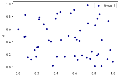 df.plot.scatter(x='c', y='d', color='DarkBlue', label='Group 1'); #先设定第一个散点图,颜色为深蓝色标签为Group 1,以cd两列作为x及y轴的值