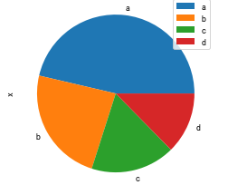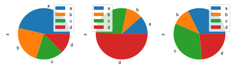 df = pd.DataFrame(np.random.rand(4, 3), index=['a', 'b', 'c', 'd'], columns=['x', 'y', 'z']) df.plot.pie(subplots=True, figsize=(8, 4),); #df中三列数据通过subplots=True来设定画三个饼状子图
