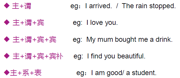 注:五大简单基本句型是万句之源;一个句子的主干有且仅有一个谓语动词,be doing 和 be done 整体看成谓语动词,动词+介词 的形式总体看成谓语动词(depend on)