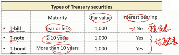 按债券期限分类: T-bill(中间不再付息,是零息债券),T-note,T-bond 刚发行债券:最近发行的主权债券。-> 收益率通常作为参考基准(因为刚刚发行,市场流动性好,价格公允) 快到期债券:不是最近发行的债券,快到期债券。 按coupon rate分类: 固定利率,浮动利率,与指数挂钩利率