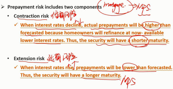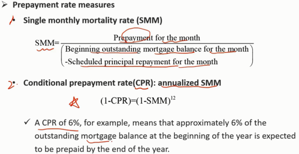 prepayment risk,contraction risk,extension risk,single monthly mortality rate(SMM),conditional prepayment rate(CPR,annualized SMM),Public Securities Association(PSA),weighted average life,