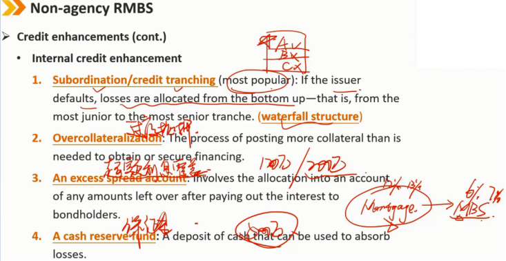 信用增级(续): 内部信用增级: 1.次级/信用分层(最常见):如果发行人违约,损失从下至上分配,即从最低级到最高级。(瀑布结构) 2.过度抵押:收取超过获得或保证融资所需数量的抵押品的过程。 3.超额利息覆盖:指将向债券持有人支付利息后剩余的任何金额分配到账户中。 4.保证金储备:可用于吸收损失的现金存款。